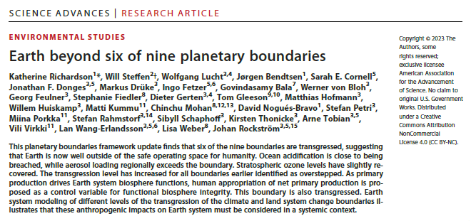 - Richardson K, Steffen W, Lucht W, Bendtsen J, Cornell SE, Donges JF, et al. Earth beyond six of nine planetary boundaries. Science Advances. 2023 Sep 13;9(37):eadh2458.