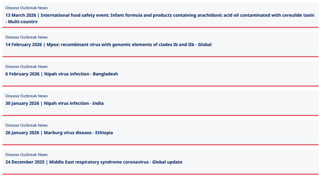 - World Health Organization. Disease Outbreak News (DONs).