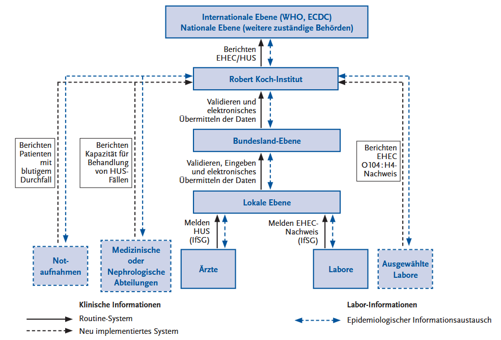 Daten- und Informationsfluss vom und zum Robert Koch-Institut während der EHEC/HUS-Epidemie[1] in Deutschland im Frühjahr 2011.